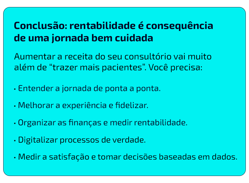 A boa notícia é que aumentar a rentabilidade não depende só de aquisição. Ao cuidar da jornada de quem já é paciente, você reduz desperdícios, melhora margens e cria um ciclo de receita muito mais sustentável.